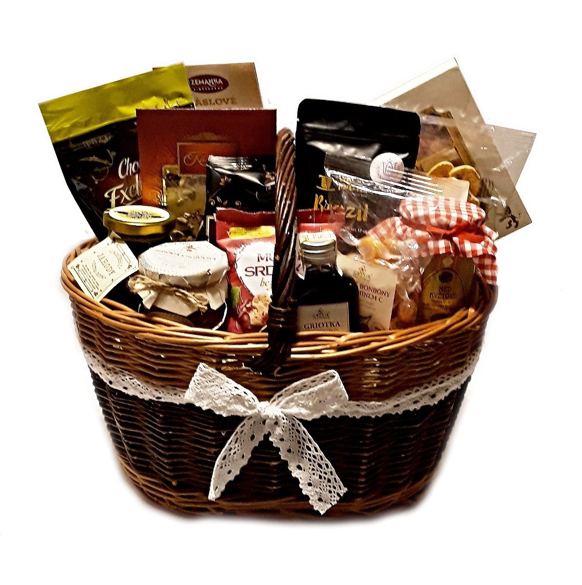Pro milovníky sladkých specialit je připraven velký sladký dárkový koš. Ochutnejte kousky ananasu naložených ve zlatavém medu. K šálku čerstvě uvařené kávy si dopřejte jemné máslové sušenky nebo brusinkové müsli v biokvalitě. Nezapomeňte vyzkoušet také delikátní jahodový extra džem nebo malé jemné čokoládky s významnými památkami Čech a Moravy. Chuťový zážitek můžete umocnit nápojem dle Vaší vlastní volby.