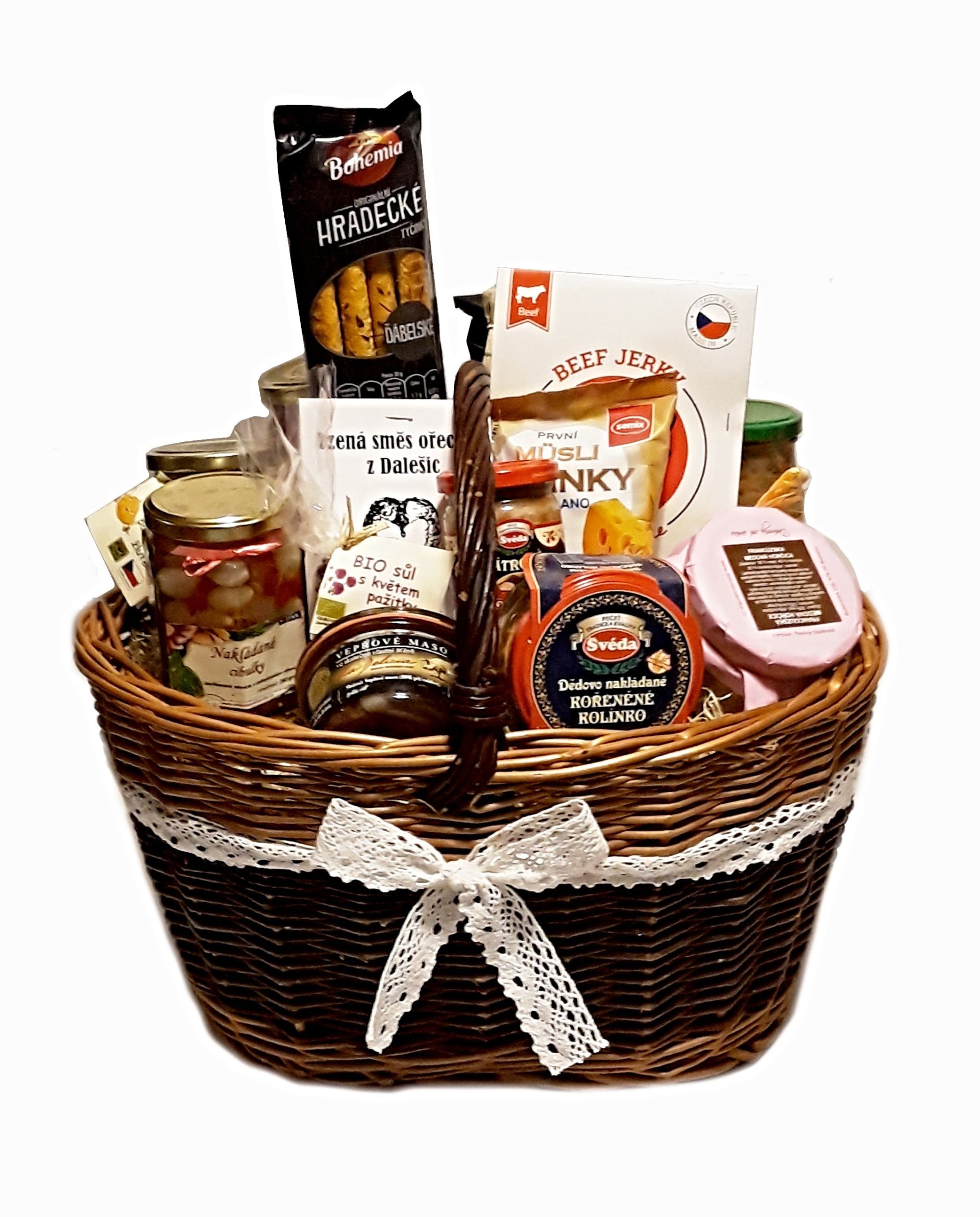 Dárek připravený speciálně pro gurmány. Darujte proutěný koš naplněný výhradně slanými českými specialitami. Ke skleničce Vámi vybraného nápoje vyzkoušejte první slané müsli nebo ďábelské hradecké tyčinky. Dopřejte si poctivé dědovo nakládané kolínko nebo kousky vybraného masa ve skutečně vlastní šťávě. K nim ochutnejte zeleninovou čalamádu nebo exkluzivní hořčici v biokvalitě.
