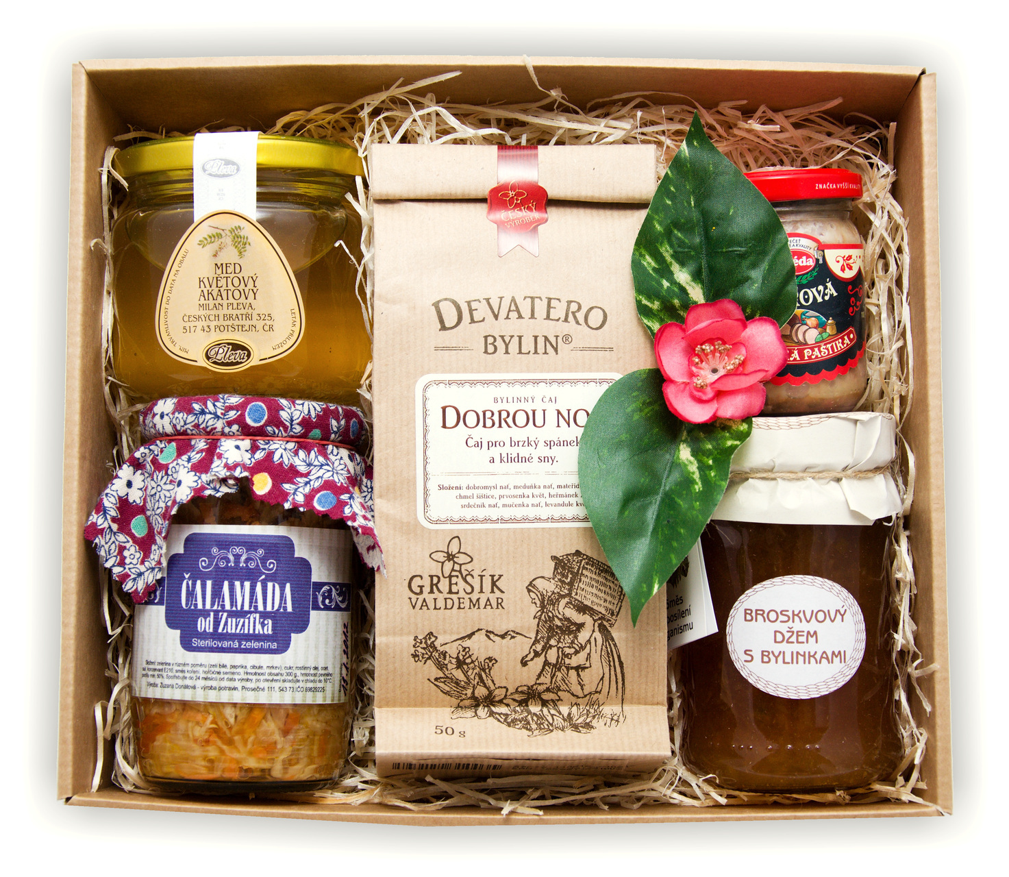 Darujte tradiční delikatesy z babiččiny spížky v dárkové krabičce. Pochutnejte si na bylinkovém čaji oslazeným zlatavým medem nebo vyzkoušejte poctivou vesnickou paštiku s originální zeleninovou čalamádou.