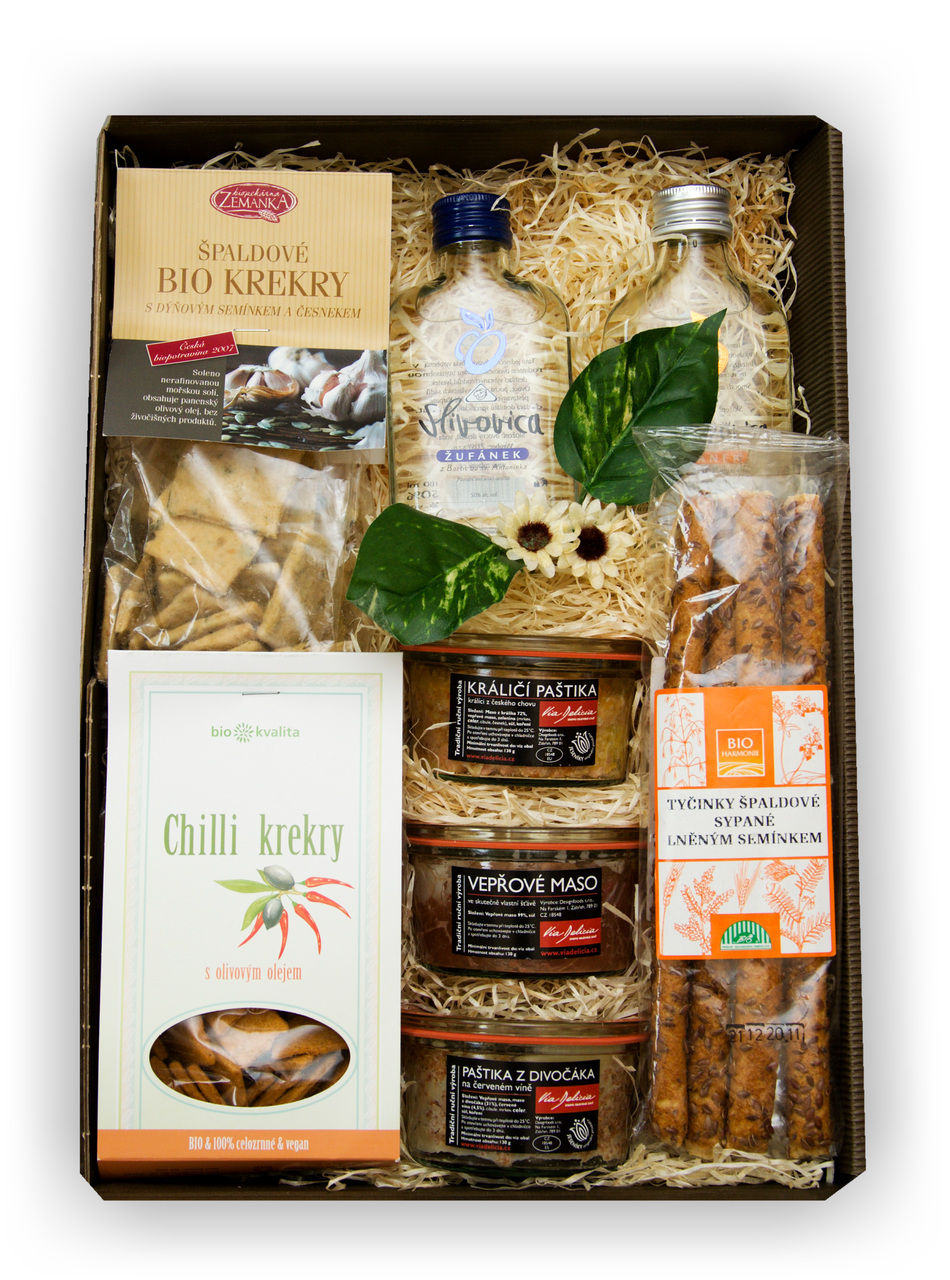 Věnujte slané delikatesy uložené do elegantní dárkové krabice. Ochutnejte jemnou králičí paštiku se zeleninou nebo provoněnou paštiku z divočáka k tomu kyselé nakládané okurky. Ke slaným krekrům vyrobených z biosurovin můžete vyzkoušet moravskou hruškovici, slivovici nebo meruňkovici.