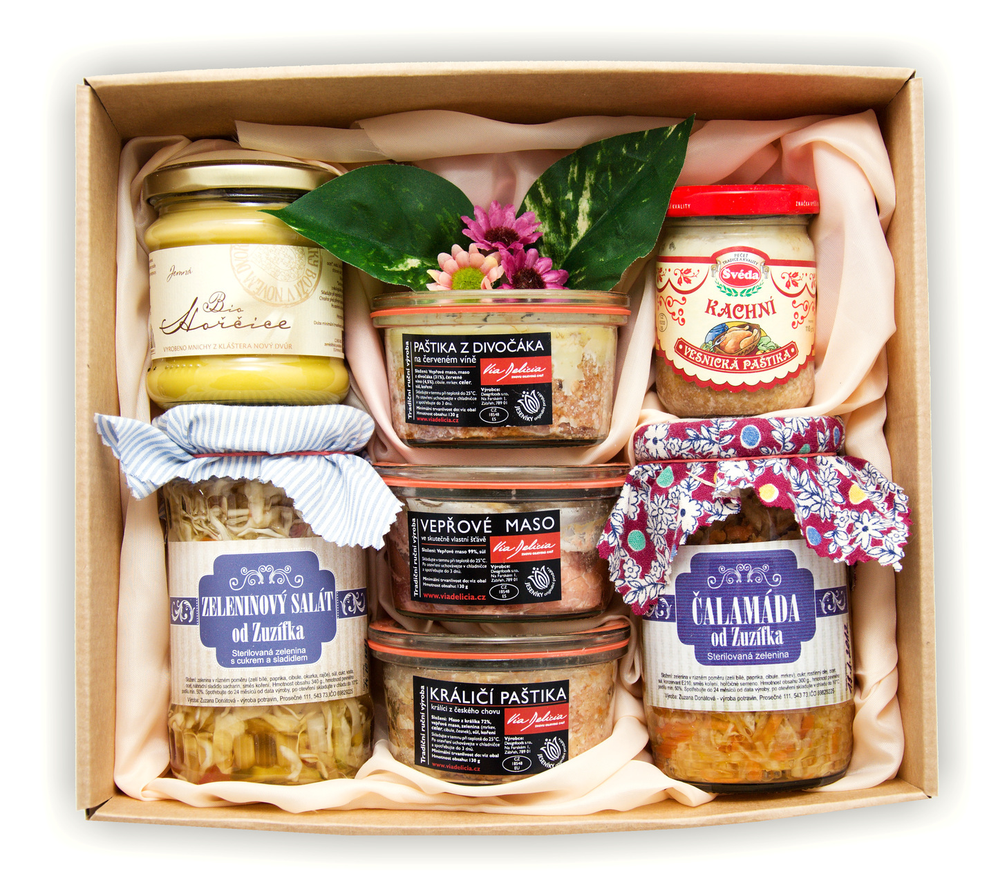 Potěšte luxusní dárkovou krabičkou naplněnou slanými českými dobrotami. K vybraným kouskům vepřového masa vyzkoušejte jemnou hořčici v bio kvalitě. Chuť voňavé paštiky z divočáka, jemné králičí paštiky se zeleninou nebo lahodné kachní paštiky ozvěží originální čalamáda.