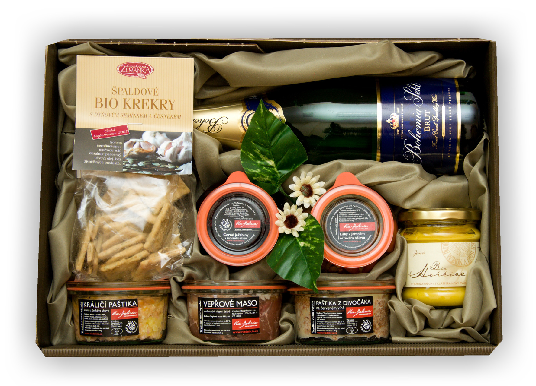 Potěšte luxusním dárkem v podobě slaných delikates ve velké dárkové krabici. K vybranému nápoji můžete ochutnat králičí paštiku se zelenínou nebo paštiku z divočáka na červeném víně. Potěšit se můžete také bio špaldovými krekry z rodinné pekárny.