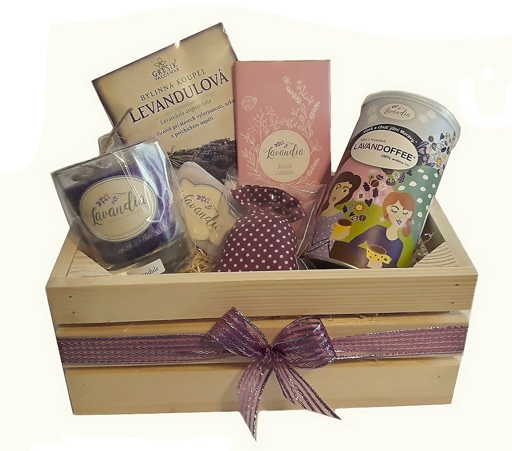 Věnujte svým blízkým voňavou levandulovou dřevěnou bedýnku s výrobky z levandulové farmy z jižní moravy. Lahodná kombinace čokolády a levandule lékařské vás okouzlí dokonalým souzněním chutí. Stačí nechat čokoládu pomalu rozpouštět na jazyku a dát si k tomu šálek levandulové kávy. Vůně levandulové svíčky ručně vyrobené zdravotně postiženými zaměstnanci Vám naladí příjemný večer.