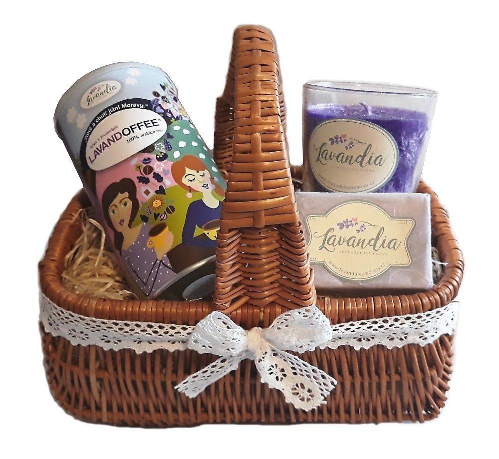 Věnujte svým blízkým voňavou levandulovou dřevěnou bedýnku s výrobky z levandulové farmy z jižní moravy. Luxusní směs mleté kávy je vytvořena pro ty z Vás, kteří touží po tradičním a vyváženém espressu s netradičním chuťovým akcentem levandule lékařské. Kombinace dvou druhů jihoamerické arabiky a levandule lékařské potěší Vaše chuťové pohárky vynikající a jemnou chutí kávy s tóny čokolády, mandlí, kandovaného ovoce a levandule, jejíž chuť se rozvine na samém začátku nebo konci konzumace kávy, v závislosti na zvoleném způsobu přípravy. Kvalitní arabika Vás nabudí a dodá Vám energii, levandule zmírní vypětí a stres - ideální kombinace pro rušné pracovní dny i chvíle pohody. Vůně levandulové svíčky ručně vyrobené zdravotně postiženými zaměstnanci Vám naladí příjemný večer.