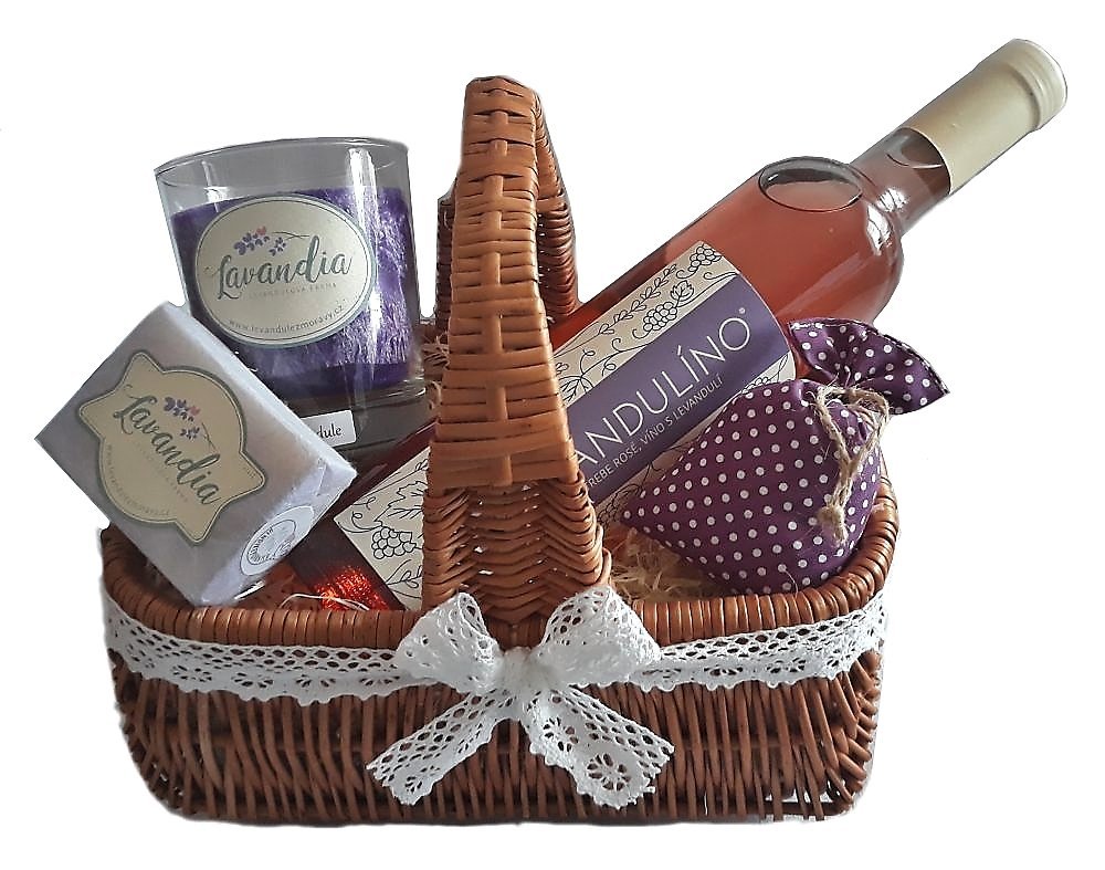 Věnujte svým blízkým voňavou levandulovou dřevěnou bedýnku s výrobky z levandulové farmy z jižní moravy. Polosladké Moravské zemské víno. Svěží, výrazně ovocné s vůní připomínající čerstvě natrhané listy jahodníku. ZWEIGELTREBE ROSÉ víno s levandulí 2018 z limitované edice a vVůně levandulové svíčky ručně vyrobené zdravotně postiženými zaměstnanci Vám naladí příjemný večer.