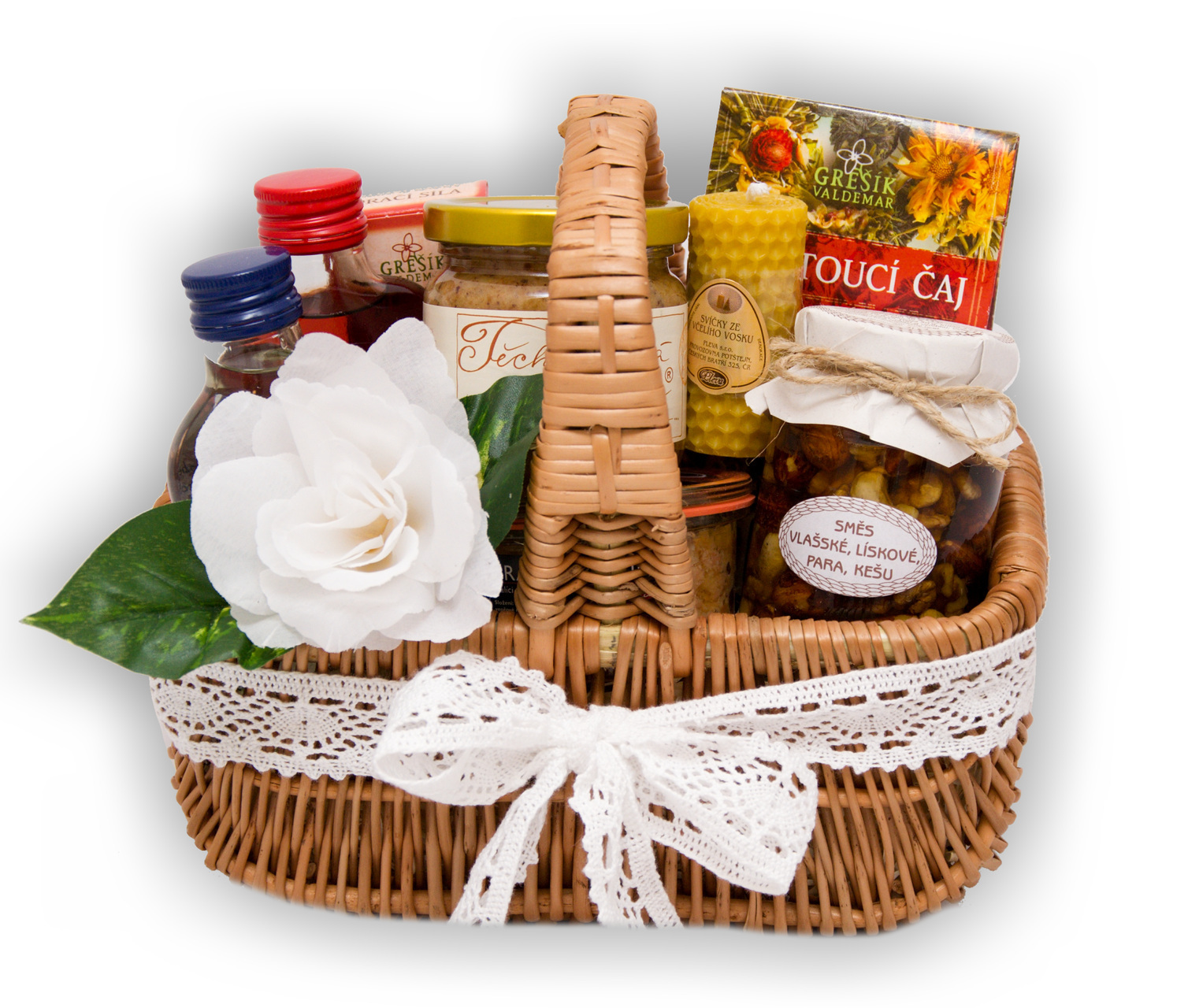Věnujte svatební dárkový košíček s českými delikatesami a elegantní svatební dekorací. Nevěstu potěší med s rakytníkem nebo lahodný bylinkový čaj. Ženicha jistě osloví exkluzuvní chuť poctivé králičí paštiky nebo sklenička pravé moravské slivovice.