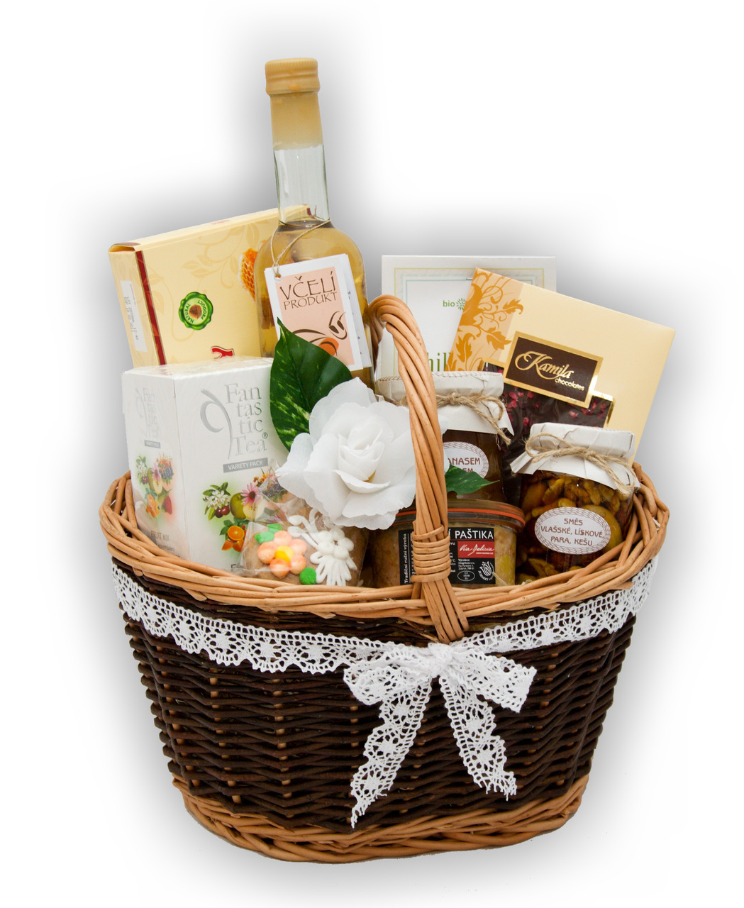 Věnujte novomanželům svatební dárkový koš v jemných bílých barvách. Ke zlatavé medovině mohou nevěsta s ženichem ochutnat jemné medové kuličky nebo exkluzivní čokoládová srdíčka. Ze slaných dobrot nelze vynechat výběrovou králičí paštiku.