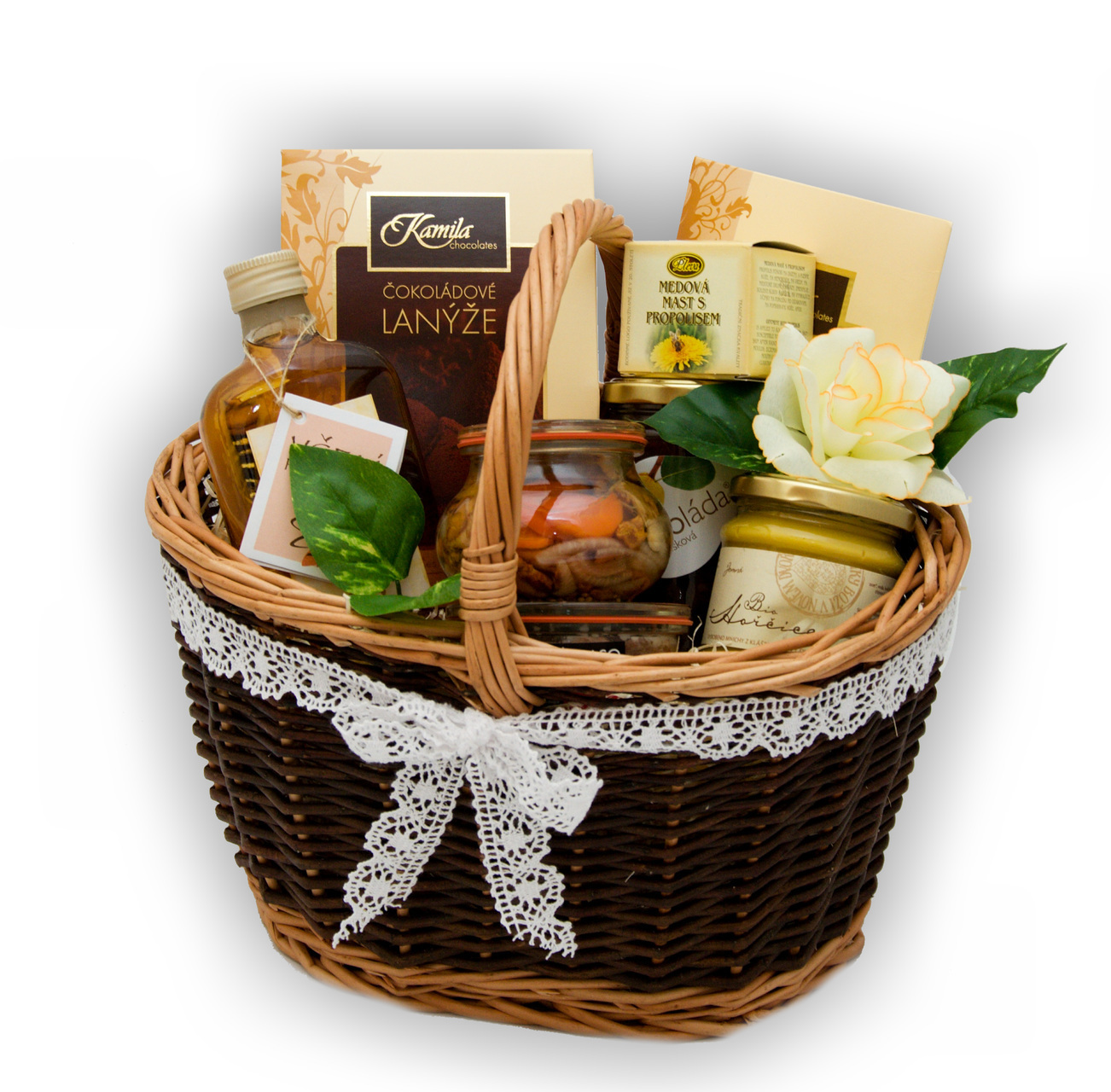 Darujte luxusní svatební dar v podobě proutěného dárkového košíku v elegantních zlatých barvách. Pro ženicha s nevěstou jsme připravili medové kuličky s jemnou náplní nebo originální bioládu s hruškami. K vybraným kouskům naloženého vepřového masa se výtečně hodí nakládané patizonky.
