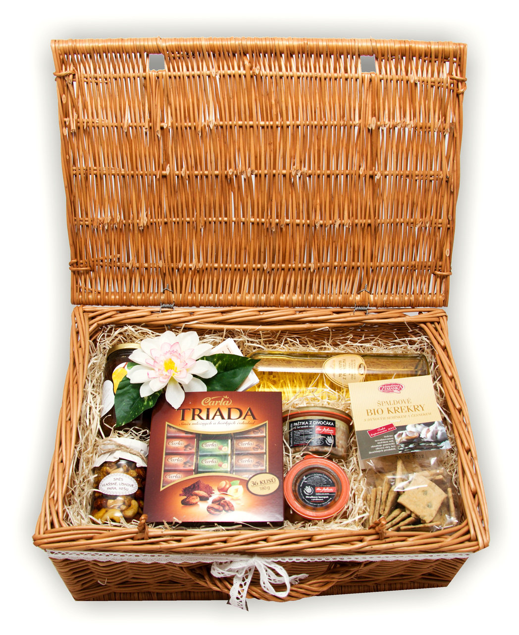 Darujte elegantní proutěnou truhličku naplněnou vybranými českými delikatesami. Pro milovníky sladkých chutí jsme připravili originální meruňový džem, výtečný hruškový kompot doplněný jeřabinami nebo 18 kousků mléčných a hořkých čokolád s českými městy. Vyznavači slaných dobrot mohou vyzkoušet špaldové krekry z rodinné biopekárny nebo voňavou paštiku z divočáka .